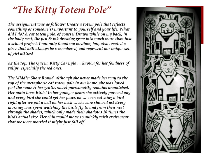 The concept of the "pet totem pole" originated from a high school project which I did while in my body cast (following spine surgeries for Spondylolisthesis). The initial description of the art project was the following: Create a totem pole drawing that details a particular love and interest in your life. Of course, I chose cats as my specific love and interest, and the drawing soon took on a life of it's own! As previously mentioned, I took the opportunity to both show my love for kitties, as well as creating a design concept that would celebrate my cat's individual personalities.